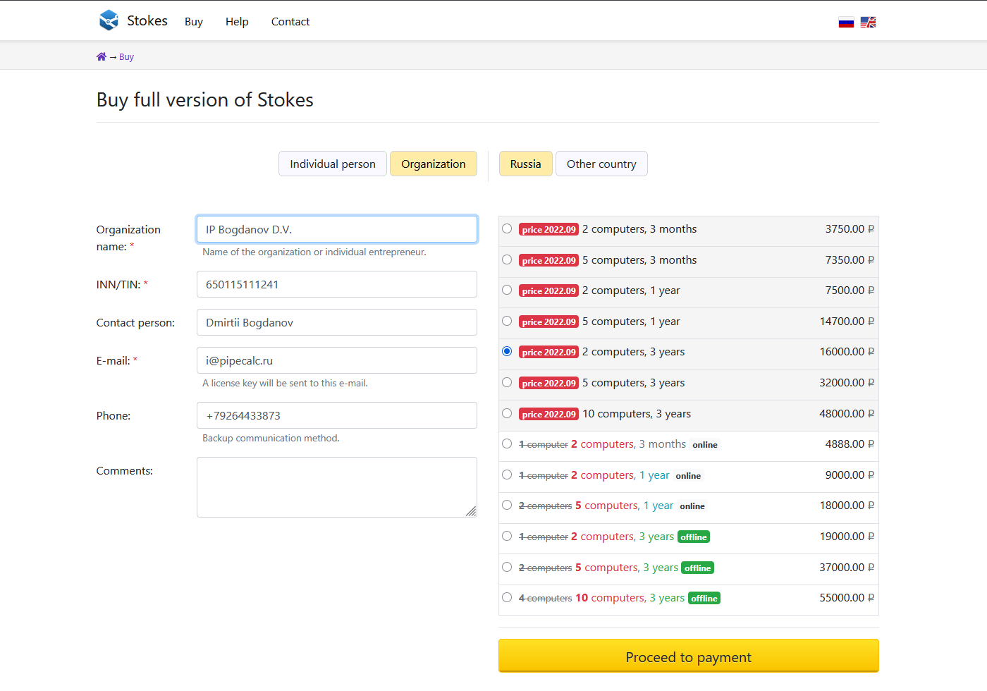 The difference between this special form and the usual one is that there are old license options – with prices that were valid at the time of purchase of your previous license. These options are highlighted in gray background.