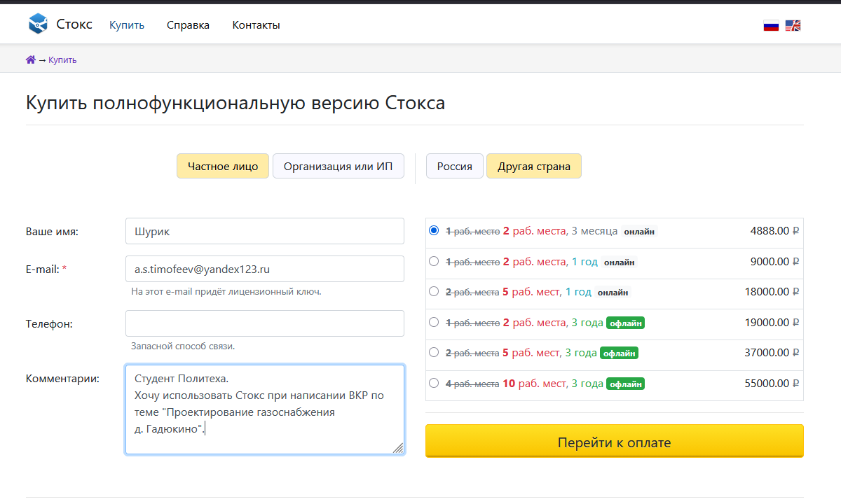 - Тип лицензии выбирайте самый дешёвый. Параметры всё равно будут изменены при обработке заказа.